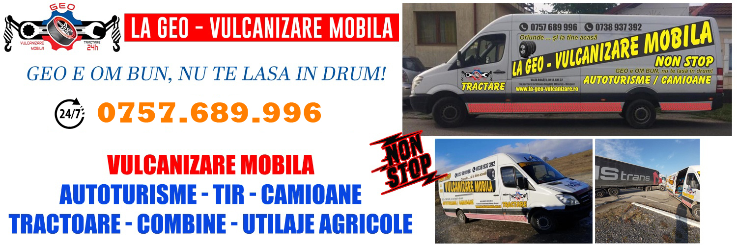 LA GEO va ofera servicii de vulcanizare mobila non-stop si tracatari auto pe raza judetelor Covasna si Brasov pentru autoturisme, tir, camioane, tractoare, combine si utilaje agricole. In cazul in care depanarea nu se poate remedia pe loc, va punem la dispozitie anvelope de schimb. Dispunem de autospeciala moderna dotata cu echipamente speciale pentru service roti si vulcanizare pentru autoturisme sau camioane.